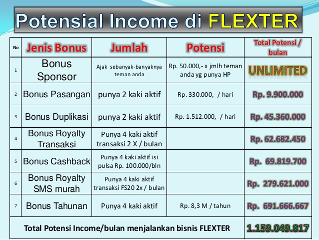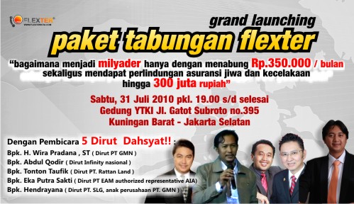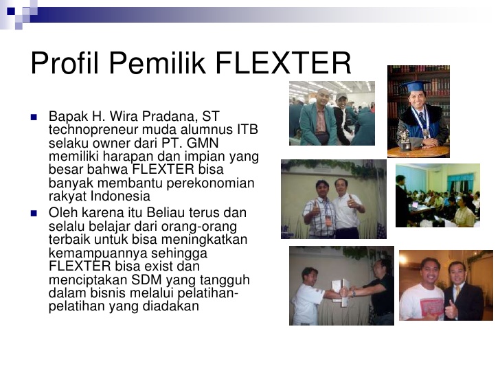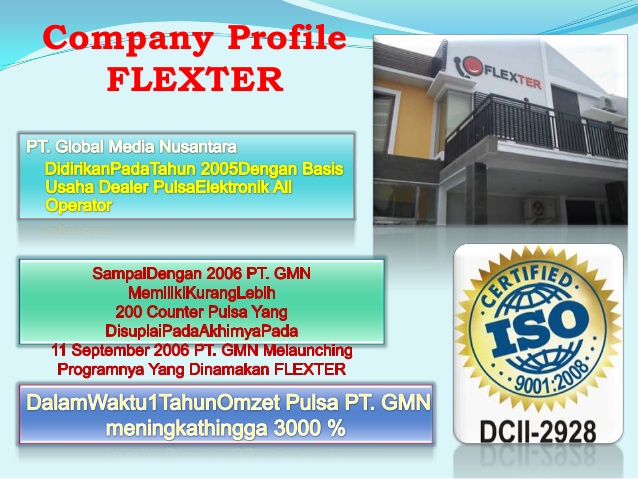 Flexter adalah merek dagang dari PT Global Media Nusantara. Pemiliknya bernama H. Wira Pradana ST, alumni Teknik Pertambangan ITB. Saat ini, MLM pulsanya udah gak jalan. Namun, perusahaan ini beralih penawaran ke Investasi Pohon Jabon. Sekarang malah nawarin program Haji & Umroh.