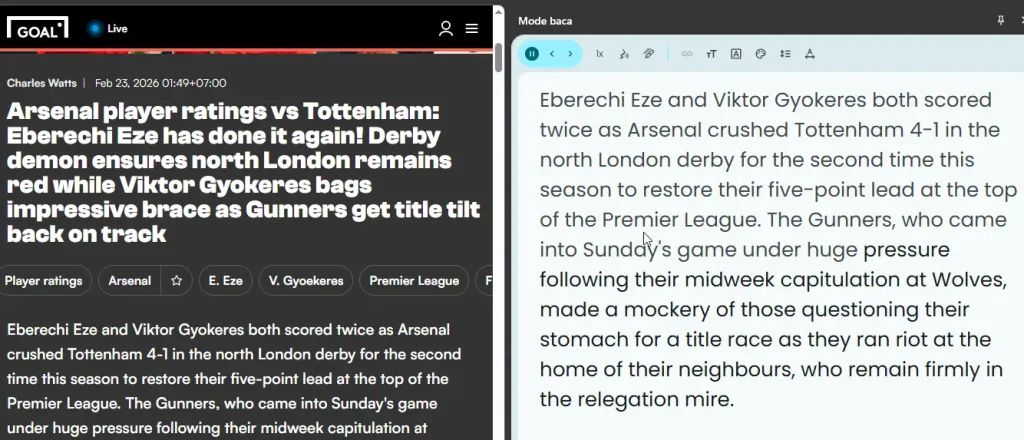 - Reading Mode (Mode Baca): Fitur ini bakal bersihin artikel dari iklan dan sidebar yang ganggu. Teman-teman tinggal buka panel samping, terus teksnya bakal muncul dengan rapi di situ.